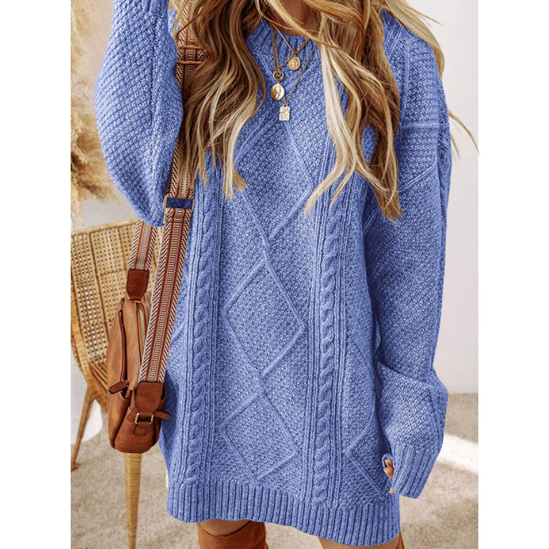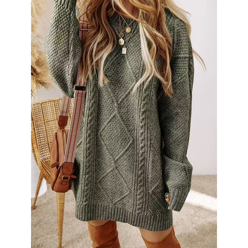 The kind of sweater dress you reach for on repeat: chunky cable knit that adds dimension, drop shoulders that let you actually breathe, and a tunic length that pairs with everything in your closet.