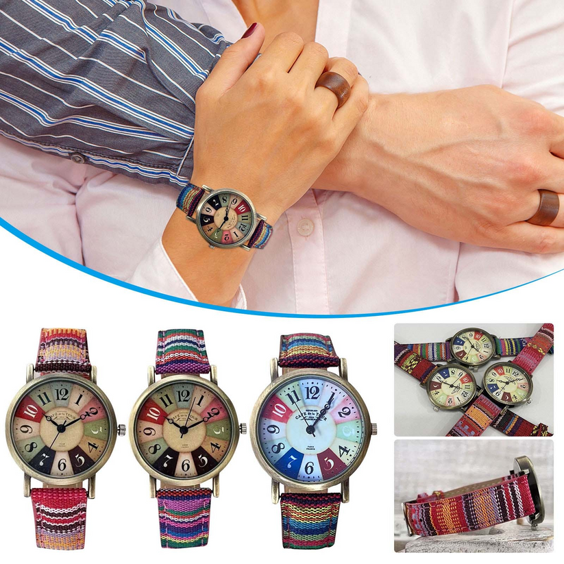 This product features: celebrate every hour with a bold, multicolor dial framed in a vintage brass-toned bezel for an effortlessly retro vibe. the handwoven strap, featuring vibrant striped patterns, adds a playful, artisanal charm that's perfect for daily wear or standout accessorizing.