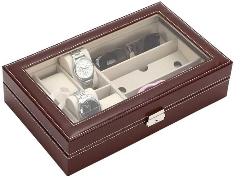 This product features: the gentleman's vault has been thoughtfully crafted to keep you organised and sophisticated, with an interior that boasts soft, suede-like compartments designed to cradle your watches and glasses, protecting them from scratches and dust ensuring your accessories stay in pristine condition.