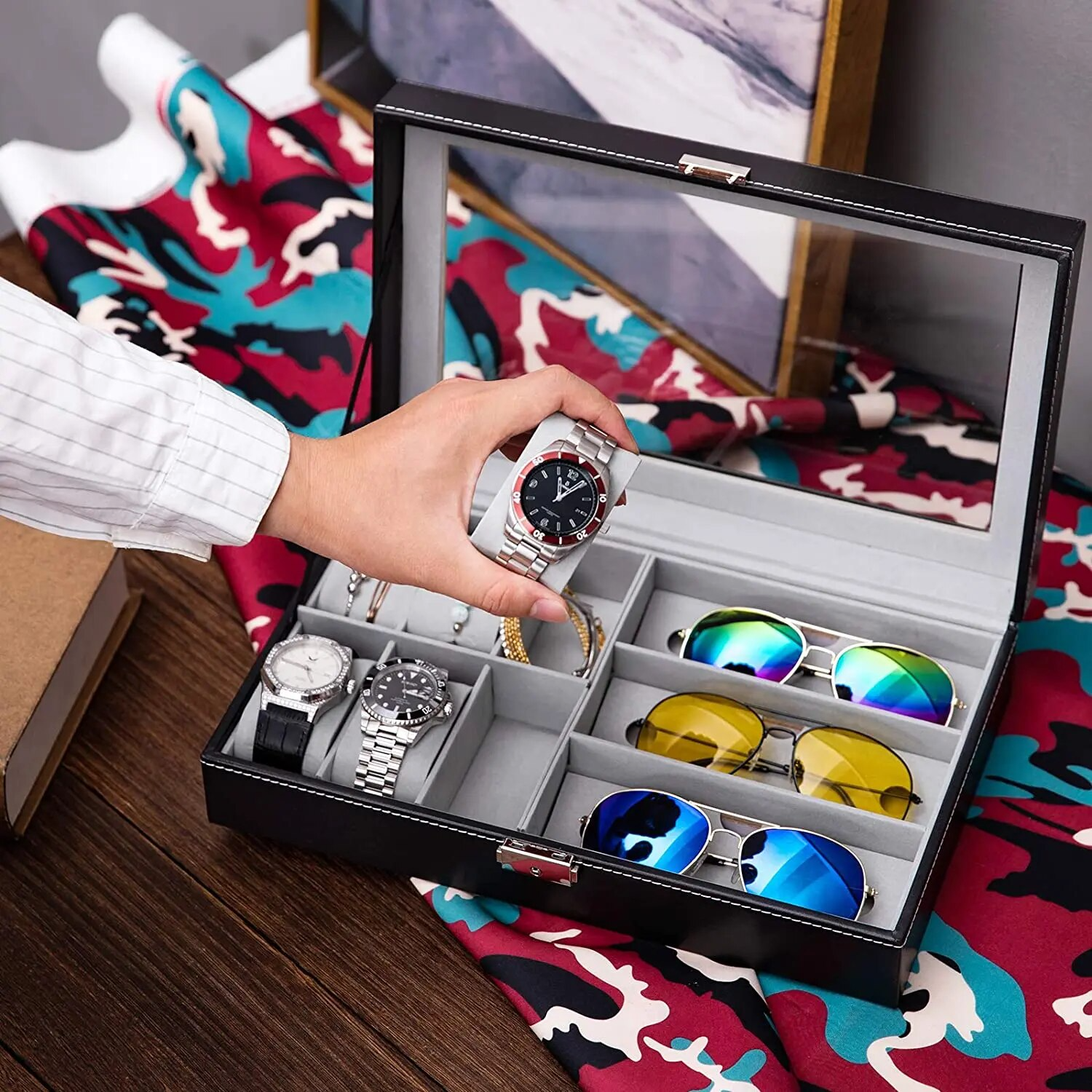 - Dual-purpose organizer: 6 watch slots, 3 sunglasses compartments