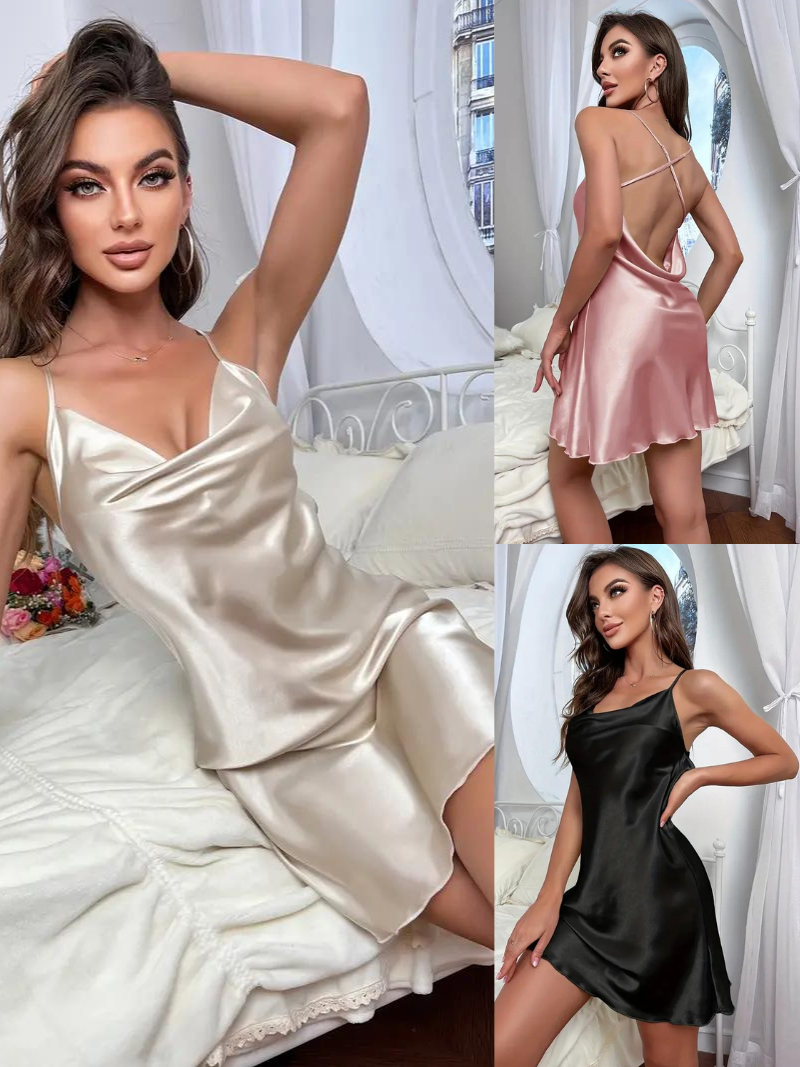 This product features: ✨ v-neck stain cami nightdress for an effortlessly elegant look.✨ backless design with spaghetti straps adds a touch of allure.✨ comfortable and stylish pajama dress for ultimate relaxation.✨ elevate your sleepwear collection with this exquisite piece.
