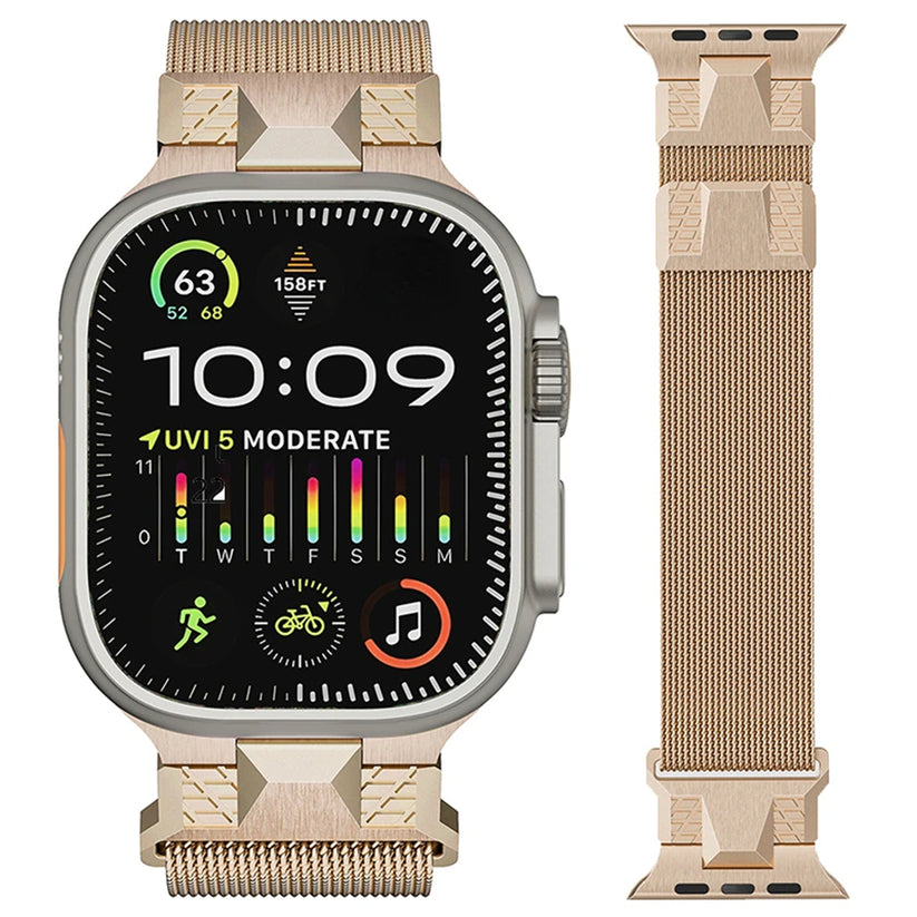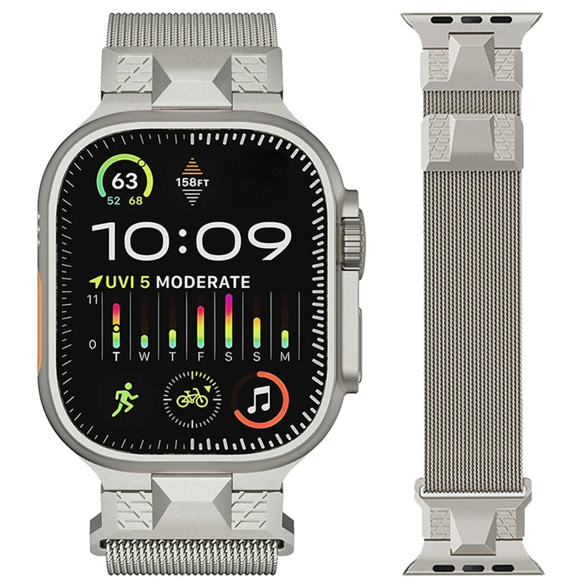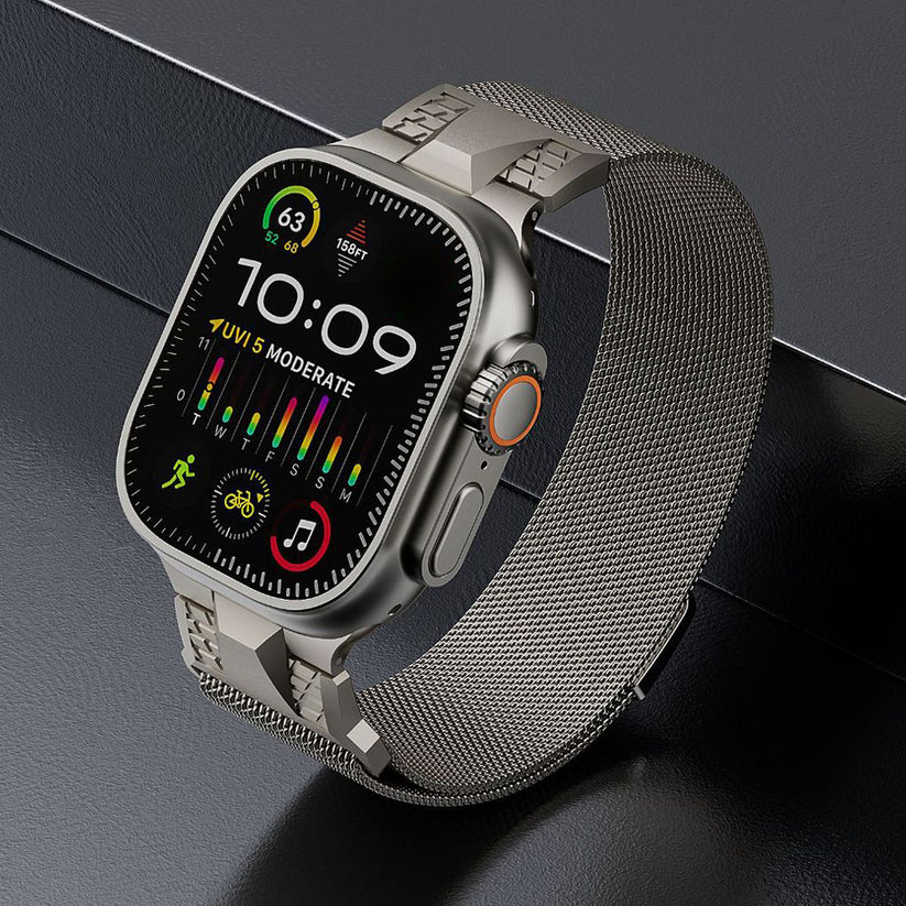 This product features: refine your look with this apple watch band, meticulously crafted with sleek titanium lugs and finished with a woven milanese stainless steel strap for a sophisticated and modern look. once it's on, you'll love it so much that you won't want to take it off.