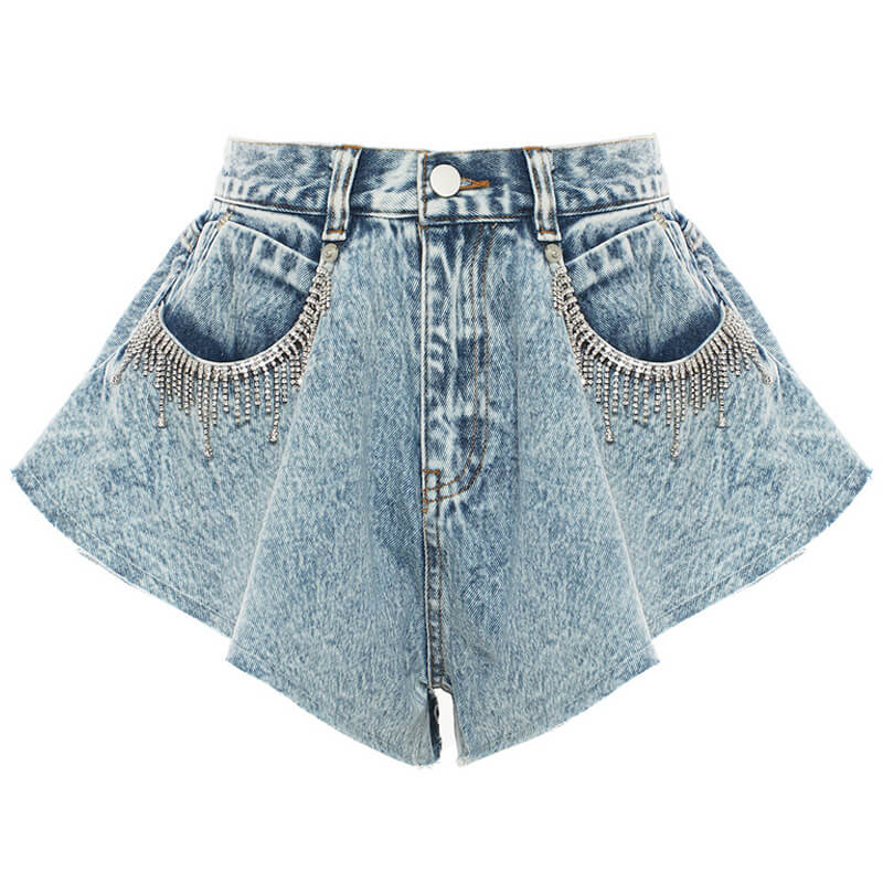 Uncover the charm of high-rise denim shorts with crystal fringe detailing on front pockets. Features soft rigid denim in blue stone wash, wide-leg ruffle design, and button-zip fastening. Classic five-pocket construction with belt loops. Pair with a crop top for the perfect summer look..