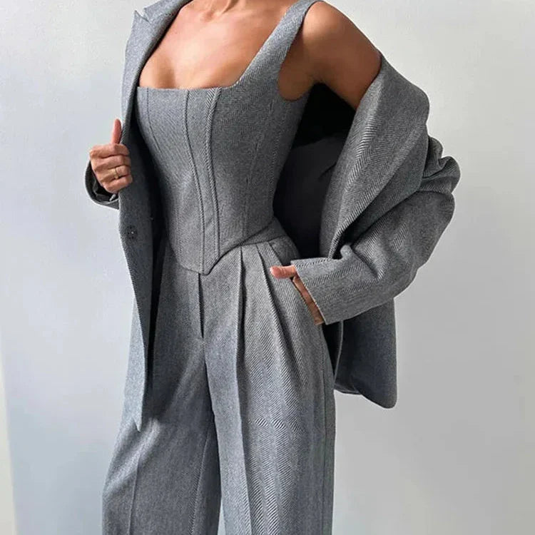 This product features: a tailored blazer, sculpted corset, and high-waist wide-leg trousers combine modern elegance with timeless class. perfect for commanding attention in the boardroom or turning heads at dinner, this set redefines power dressing.